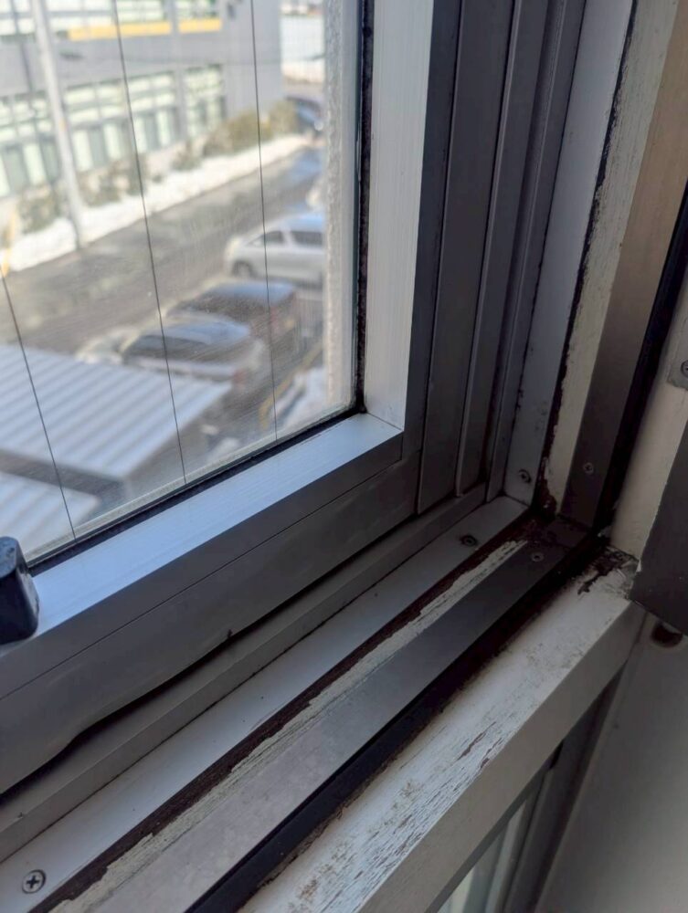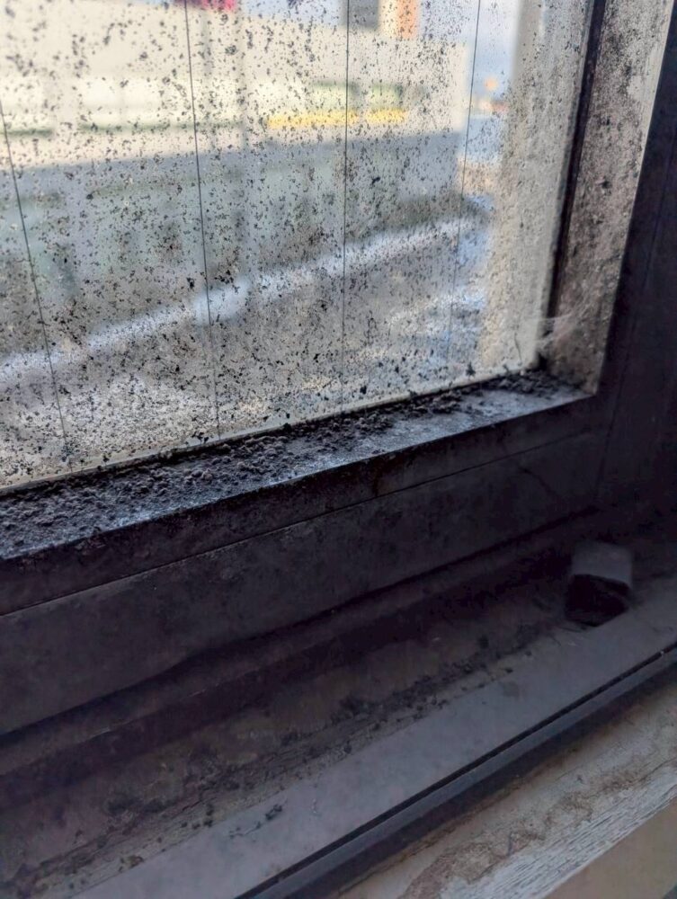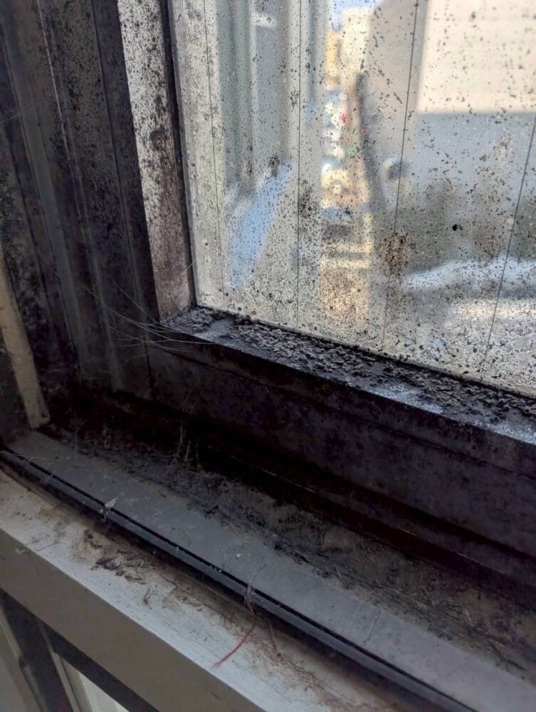 窓の清掃です。カビで真っ黒になってます。