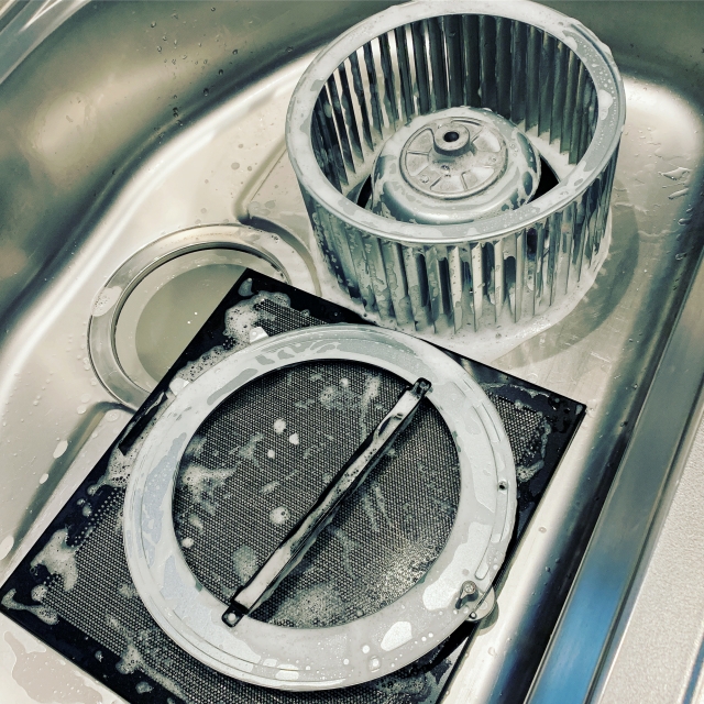 可能な範囲で羽根やファンモーターカバーを取り外し、洗剤+ブラシでこまかい溝やカバー裏の油を除去。再組み立て後は乾燥させてから復旧します。
