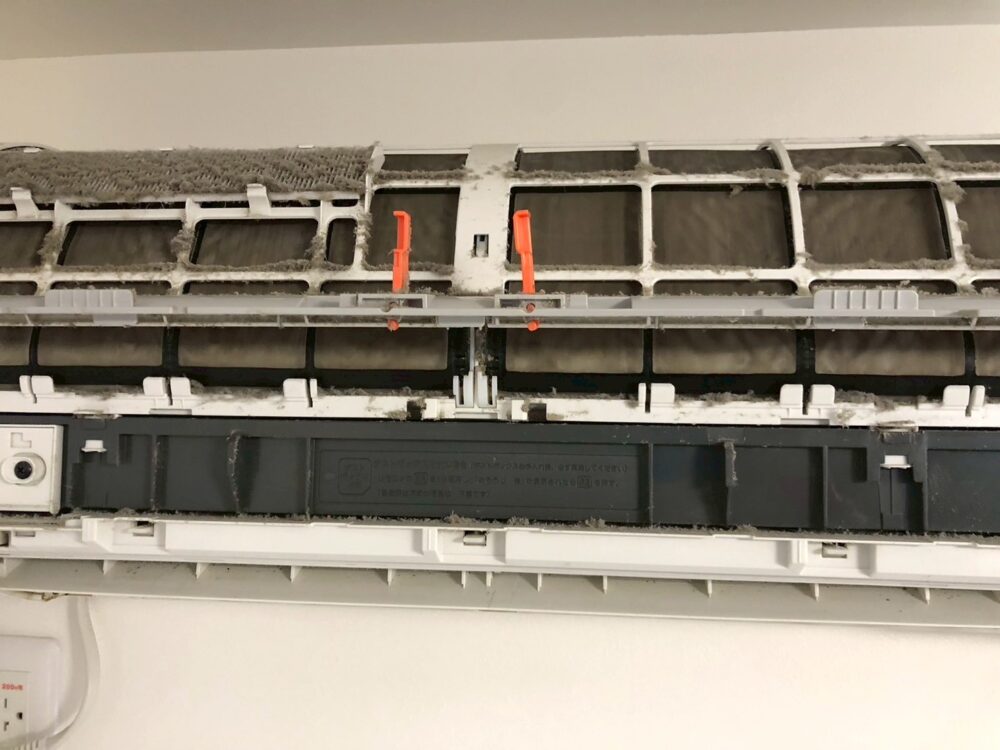 エアコンの分解清掃です。フィルターの自動お掃除機能付きタイプです。