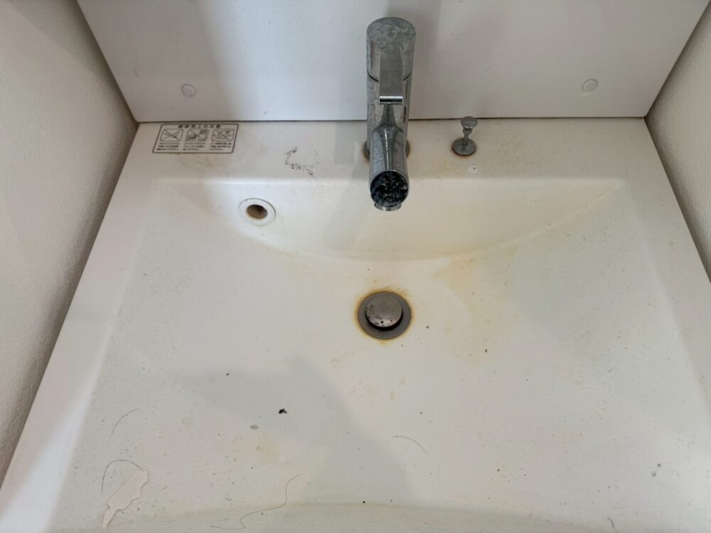 洗面台の清掃です。蛇口周り、水の溜まりやすい箇所の汚れが目立ちます。