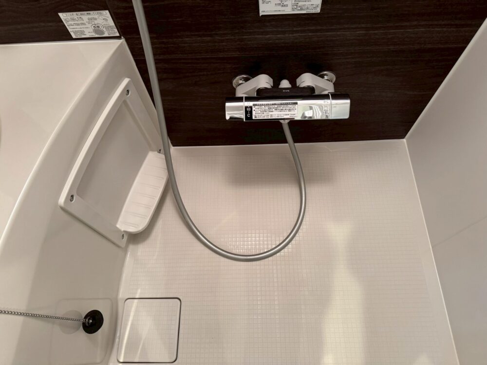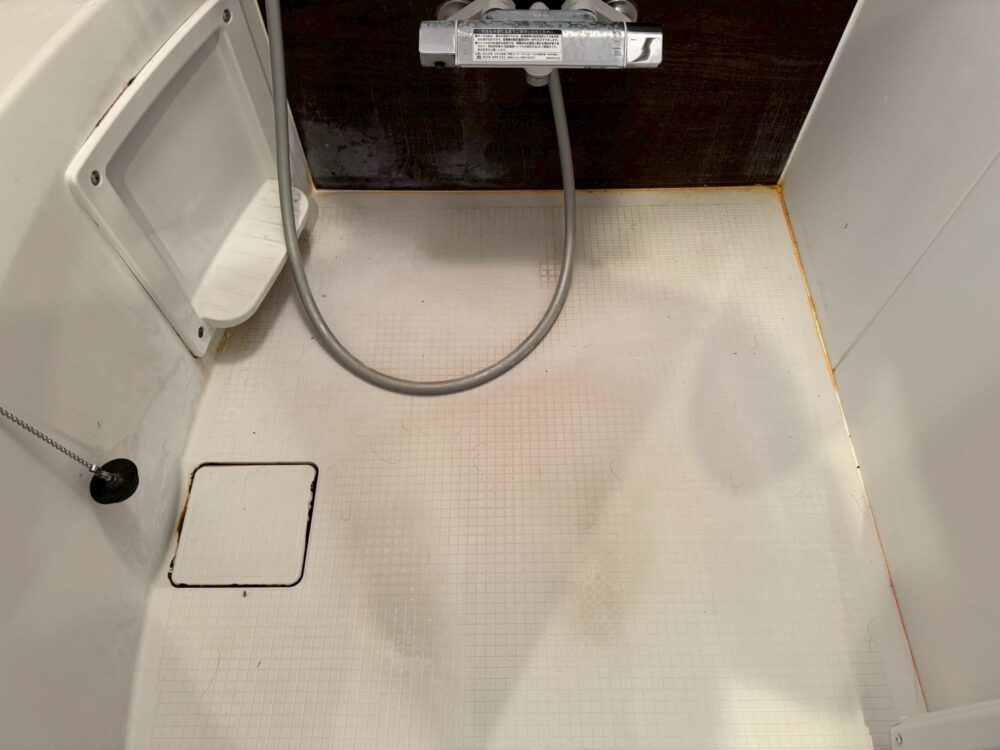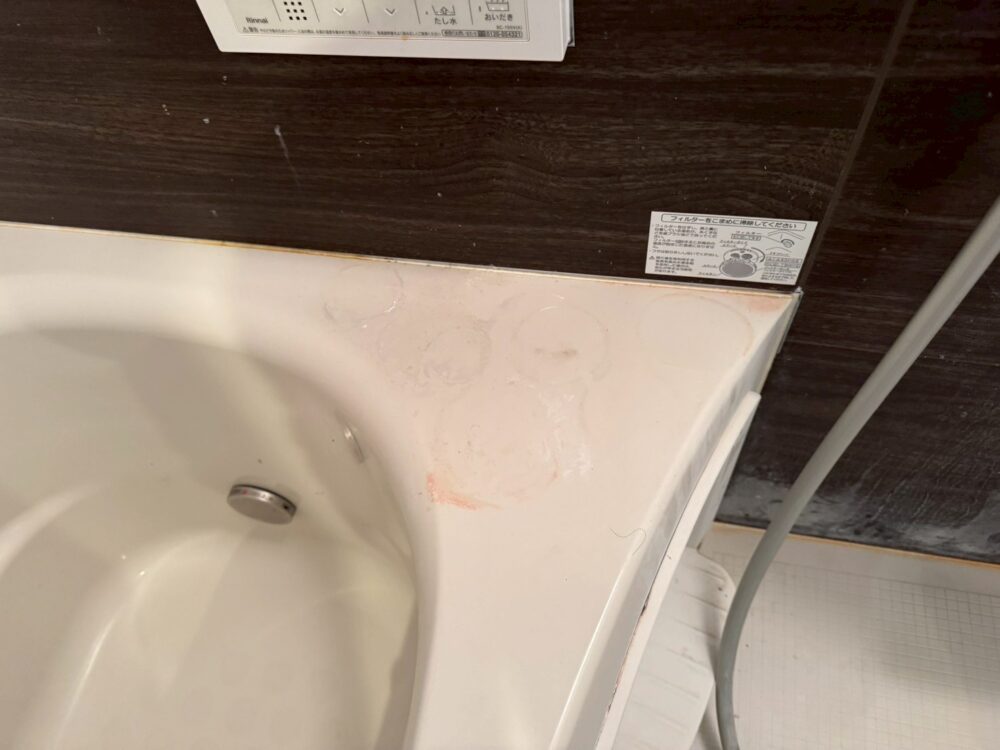 浴室の清掃です。壁の白い汚れも石鹸カスです。