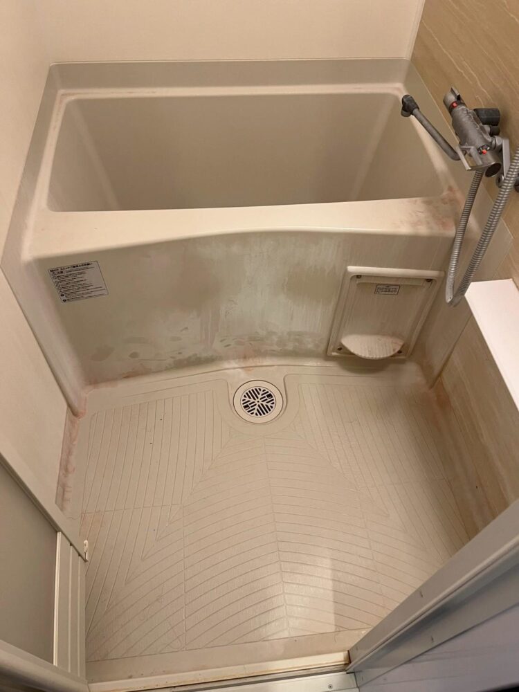 浴室の清掃です。石鹸カスで真っ白になっています。